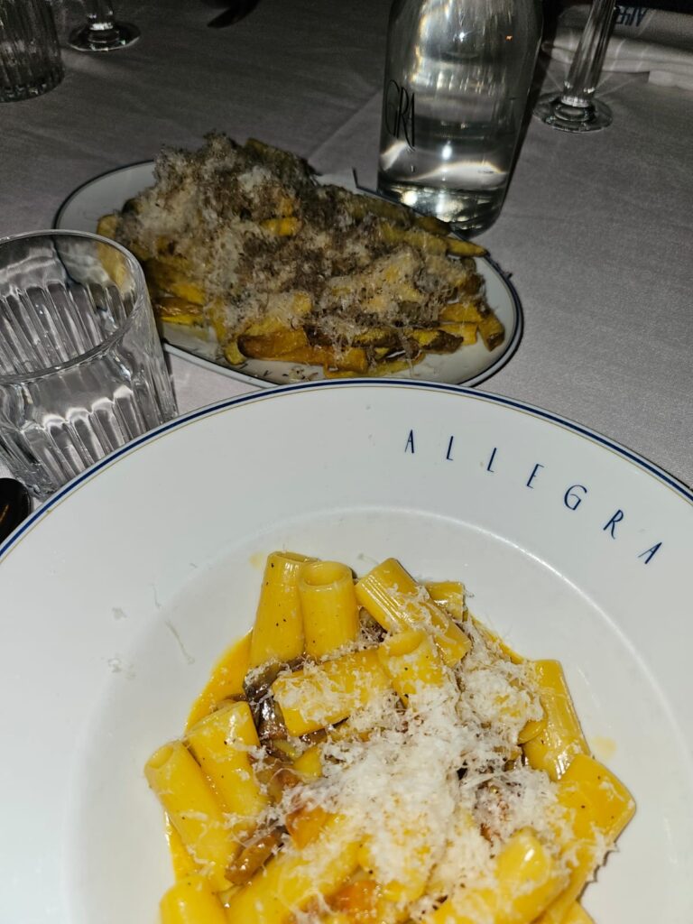Allegra is definitely not a budget option, but the quality makes up for it. Starters are around €20, pasta dishes are roughly €26, and if you go for meat or fish, you should expect around €30 per person. Side dishes, like the truffle fries are about €7 euros, and cocktails average around €16.